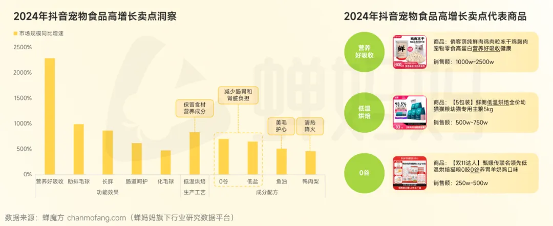 宠物生活品质显著提升,喂养标准从“吃得饱”向“吃得好”不断进阶。2024年,宠物食品高增长卖点集中在功能效果、生产工艺和成分配方三个方面。可以看出,宠物主在挑选宠物食品时,核心关注的其实是卖点背后的实际功效与优势所在,并偏向于选择营养、健康、功能化的产品。
