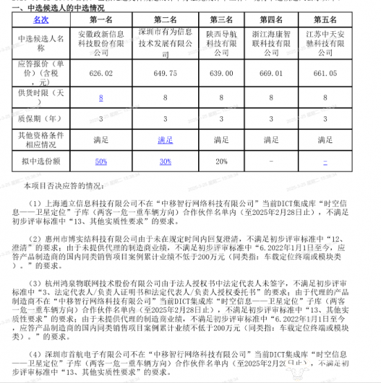 公告中并没有披露这两家企业出局的具体原因,不过通过五家中选候选人的单价应答报价来看,这两家厂商的报价偏高。具体来看,第一名政新信息应答报价(含税单价)为626.02元;第二名有为信息为649.75元;第三名陕西导航科技为639元;第四名海康智联为669.01元;第五名中天安驰为661.05元。