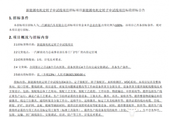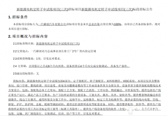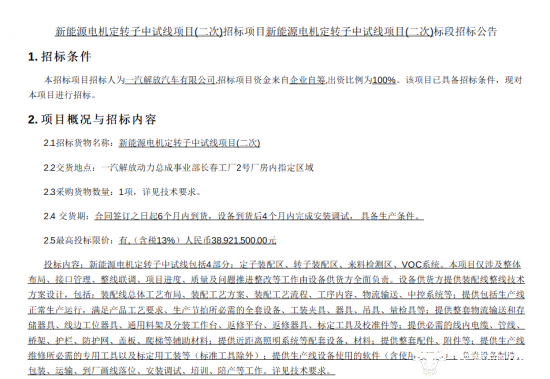日前,一汽解放发布“新能源电机定转子中试线项目(三次)”中标结果,一家成立还不足5年时间的公司中标,这一结果让人意外。同时很显然的是,该项目已经经过了三次招标。