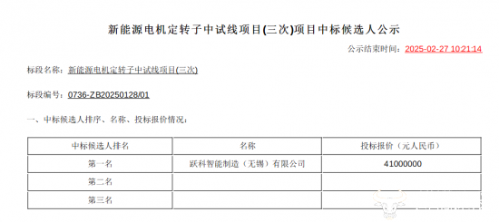 经过三次招标后,2月24日,一汽解放终于发布中标候选人公示,跃科智能制造(无锡)有限公司是唯一上榜的供应商,暂不清楚是否有其他厂商参与投标或者被否决。