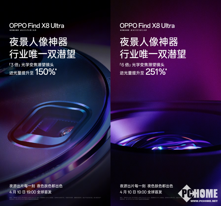 OPPO Find X8 Ultra被誉为“夜景人像神器”,将搭载3倍和6倍光学变焦潜望镜头,对比OPPO Find X7 Ultra,进光量分别提升150%和251%,暗光场景表现更出色。