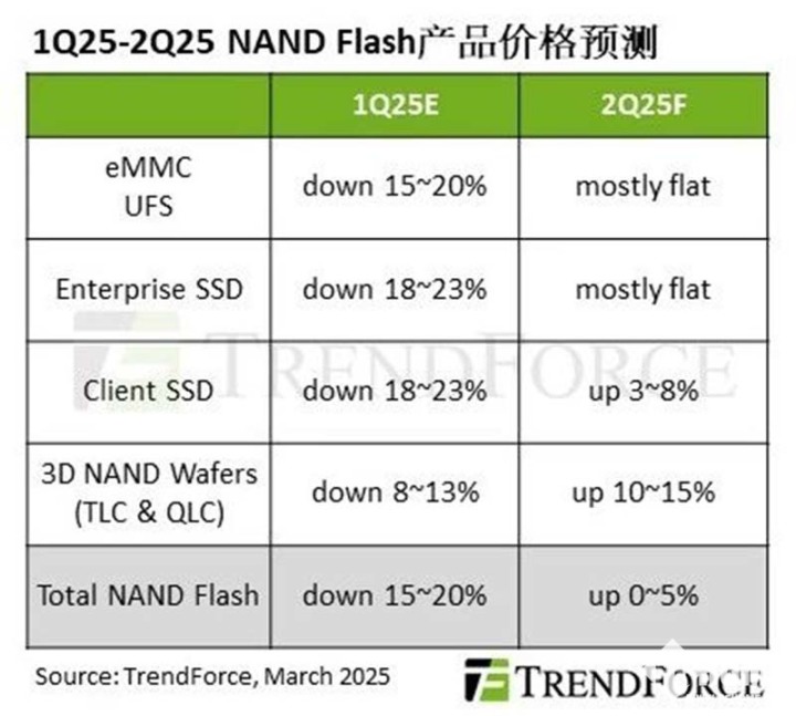 TrendForce集邦咨询最新调查显示,预计2025年第二季度NAND Flash价格将止跌回稳,晶圆和Client SSD价格则是季增。