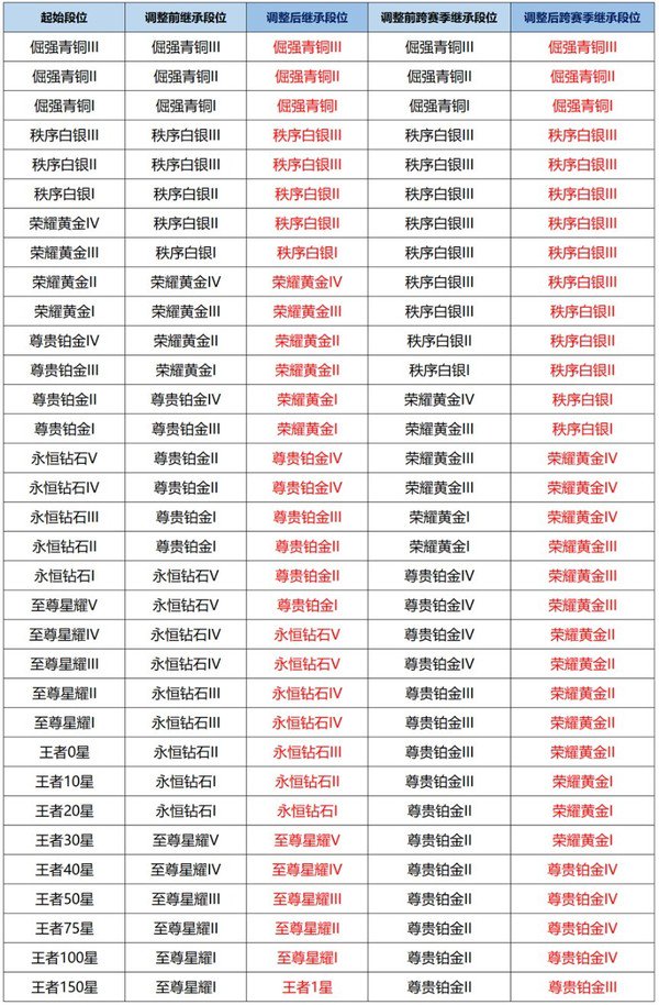 上个赛季可能不少玩家赛季末努力冲分,为了新赛季能够继承一个相对较高的段位,让上分容易一些。不过本赛季的继承机制做了调整,调整了起始段位为尊贵铂金二——荣耀王者150星以上的段位继承方式。其中,有几个明显的分界点,铂金二由原来的铂金五调整为黄金一,钻石一由原来的钻石五调整为铂金二,王者10星由钻石一调整为钻石二,王者150星由星耀一调整为王者一星。