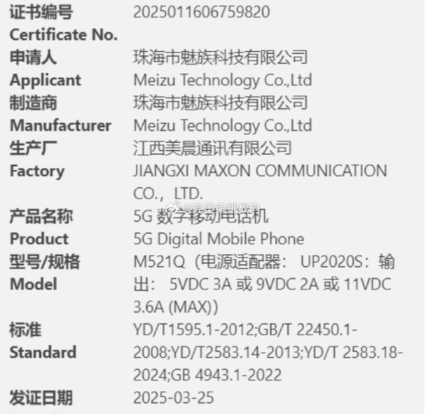 【CNMO科技消息】最新爆料显示,魅族22系列可能会在今年五月发布。而在那之前,魅族可能会发布多款入门级新机。3月26日,CNMO注意到,珠海魅族科技有限公司旗下一款型号为“M521Q”的5G数字移动电话机已经通过了国家认证,生产厂商为江西美晨通讯有限公司。