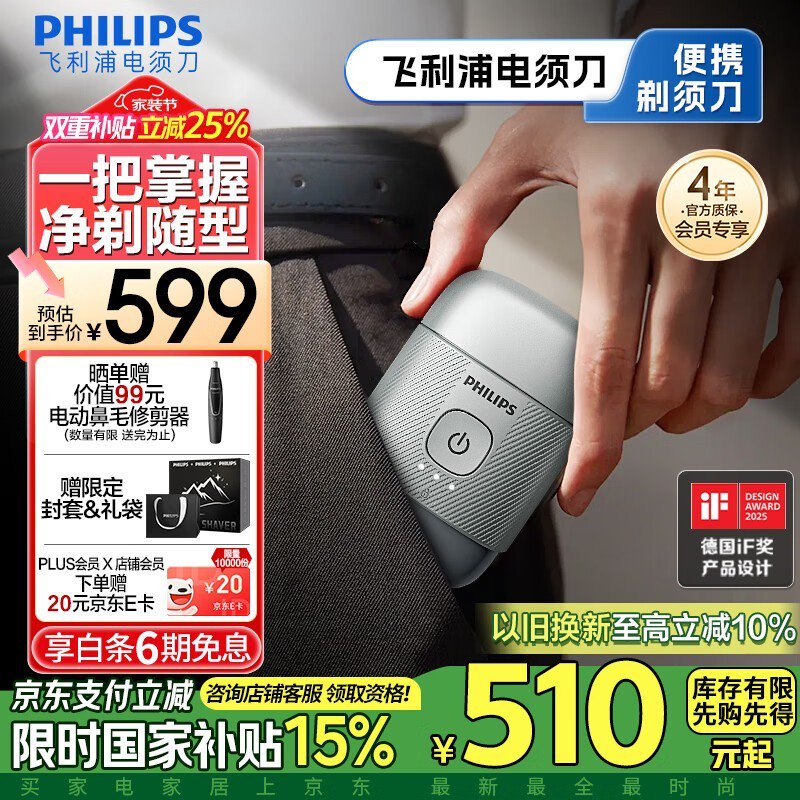 飞利浦RQ892电动剃须刀冰川银简约大气多向贴面技术