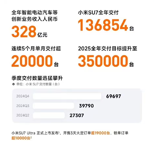 2021年3月,小米集团发布公告,宣布将进军汽车行业。2023年12月,小米首款轿车小米SU7亮相。2024年3月,小米SU7上市,发布三款车型,并于同年4月开始交付。根据小米公司董事长雷军的说法,小米SU7上市11个月,累计销售超过32万辆,累计交付超过18万辆,还有积压未交付订单超过15万辆。