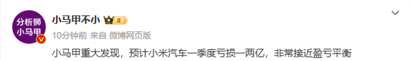 预计小米汽车一季度亏损不到两亿 今年有望实现盈利?