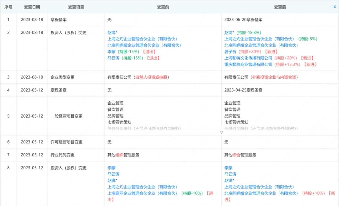 根据企查查信息显示,2023年5月大祥哥的北京阿妮娅企业管理合伙企业成为了上海立兆满企业管理有限公司的股东,持股10%。三个月后,公司的两位股东李某和马某退出,公司引入了三位新股东,直接拿走了公司53.3%的股份,赵某本人也有一定程度的稀释。股权变更带有一定的滞后性,所以情况基本与大祥哥所述一致。