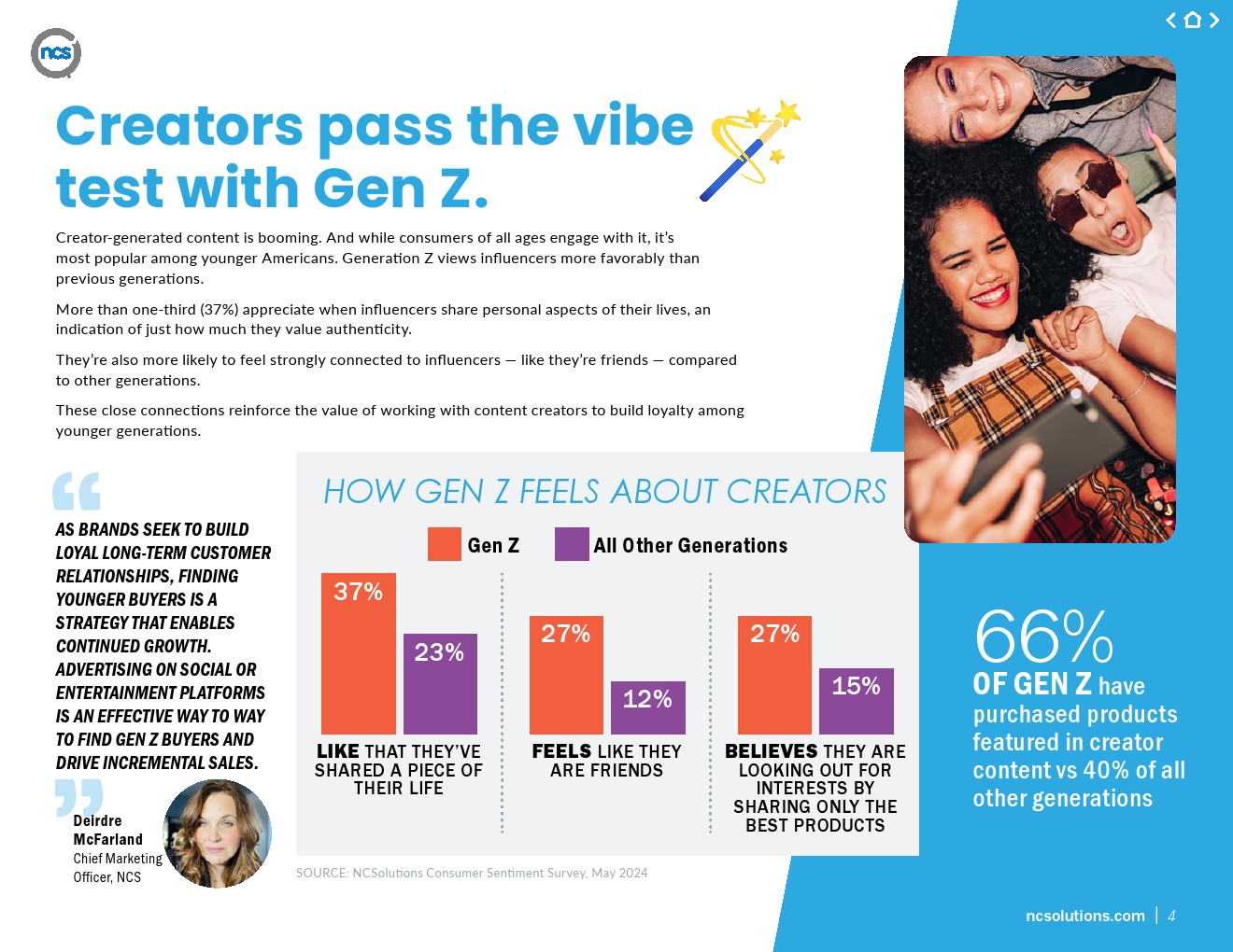 关于Z世代,这项最新研究强调了他们对创作者的亲和力,60%的Z世代受访者购买了创作者内容中的产品,而其他所有受访者中这一比例为40%。年轻一代比其他人更倾向于喜欢创作者分享他们生活的一部分(37%对23%),感觉创作者是朋友(27%对12%),并相信创作者通过分享最好的产品来寻找他们的兴趣(27%对15%)。
