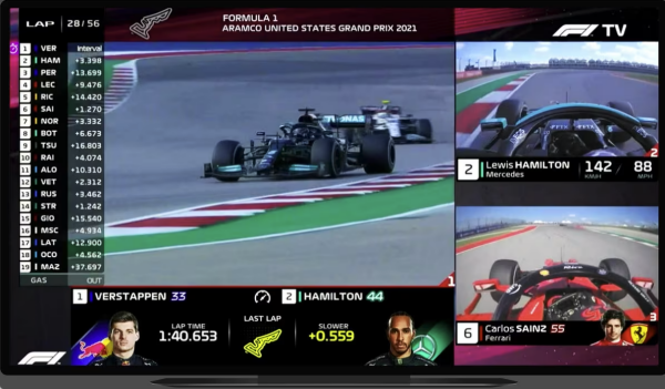 从F1 TV的广告卖点中就能发现,除了常规直播画面外,还允许用户通过F1 TV Pro在大屏幕上打造个性化观赛体验,F1 TV提供20个车载摄像头,以及常规赛道位置图、车手时间对比等内容。很多观众也喜欢在社交平台上秀出自己的个性化观赛方式,包括多窗口的主屏幕,以及用来显示其他数据信息镜头的副屏。