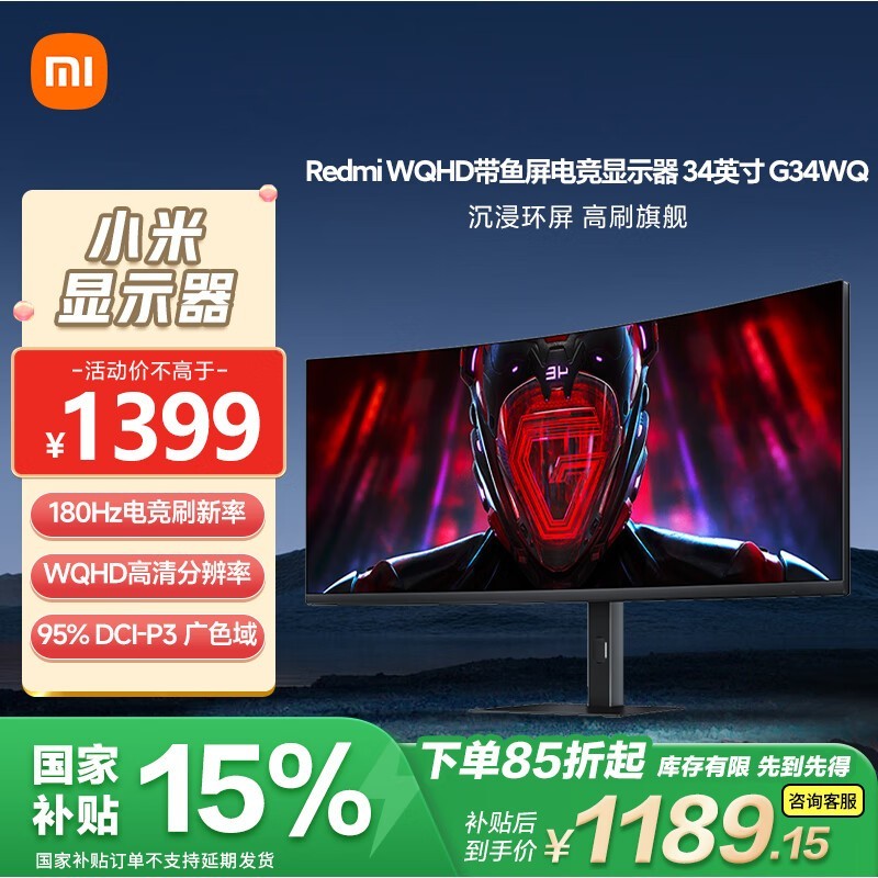 红米G34WQ显示器促销:180Hz高刷带鱼屏仅1081元到手