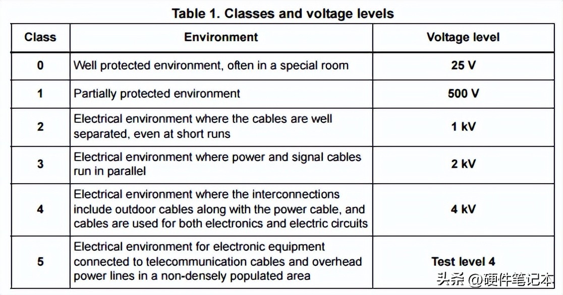 IEC61000-4-5定义了交流电源线浪涌的标准。下表提供了有关类别和电压电平的具体说明。