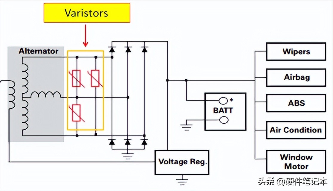 为了抵消这种负载突降的情况,经常使用电涌保护电路,如TVS和压敏电阻。