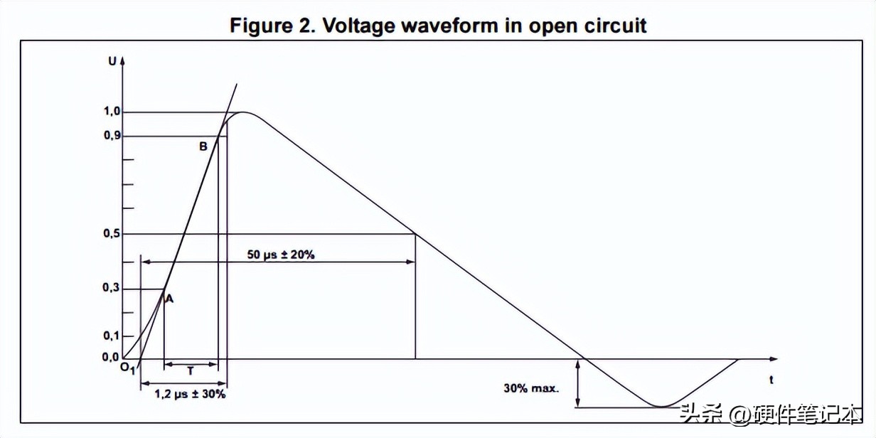 IEC61000-4-5定义的瞬态电压如下图所示。它具有1.2us的上升时间,而脉冲宽度为50us。