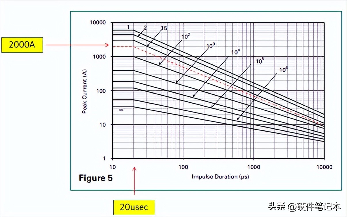 接下来要验证的是,MOV的浪涌电流额定值能够处理上面表2中指定的水平(考虑最大水平)。根据下面所选的MOV数据表,在2000A和20us脉冲持续时间下,MOV能够处理超过15次的撞击但少于100次的撞击。设备图上用虚线估计了2000A。