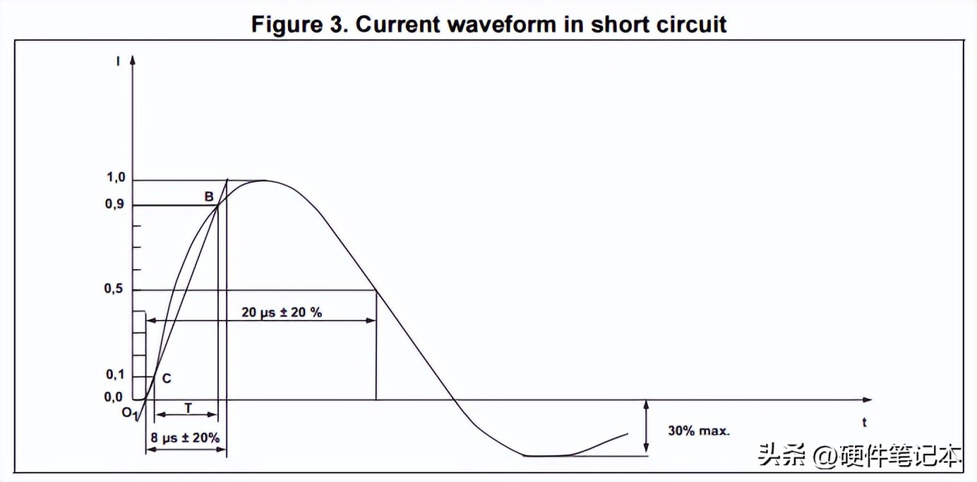 IEC61000-4-5还定义了短路电流形状,如下图所示。它具有8us的上升沿和20us的脉冲宽度。