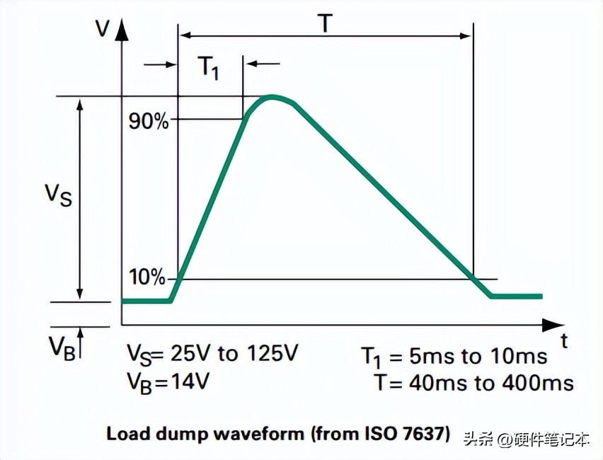 在汽车中,甩负荷波形由ISO7637定义,如下图。峰值电压最大为125V。与IEC61000-4-5定义的标准相比,上升和脉冲宽度持续时间(T1和T)更长。