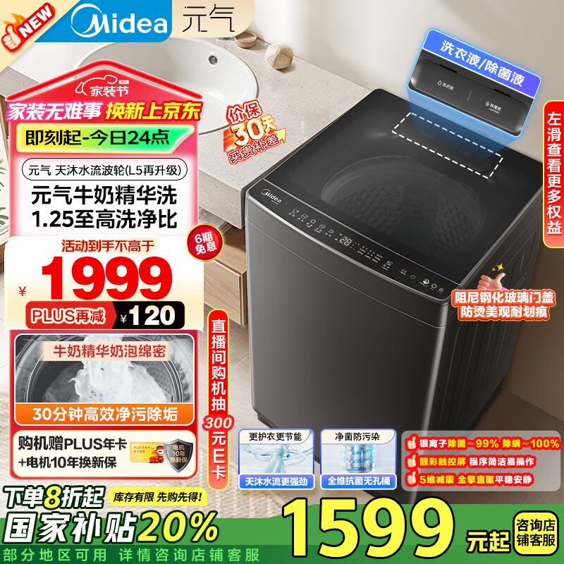 美的全自动波轮洗衣机MB10L6家用10公斤元气精华洗仅1168元