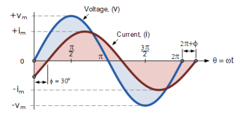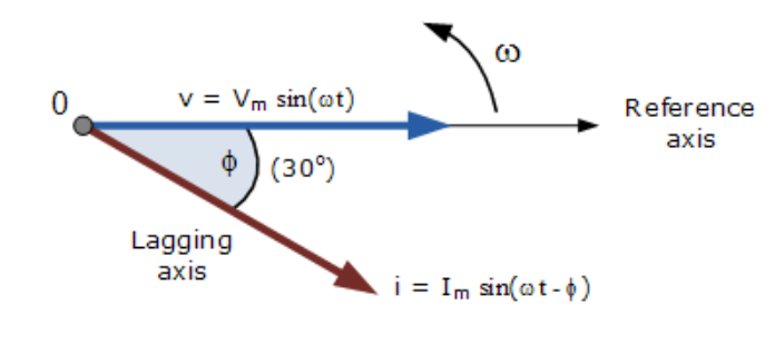 若将波形冻结在t=30°时刻,对应的相量图如右图所示。由于两个波形频率相同,电流相量仍滞后电压相量。但由于电流波形此时穿过水平零轴,可将电流相量作为新参考,并正确描述电压相量“超前”电流相量角度Φ。无论如何,一个相量被指定为参考相量,其他相量均相对于该参考相量超前或滞后。