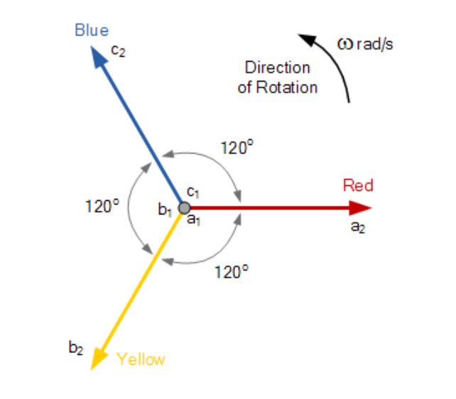 与单相相量类似,三相系统的相量也以角速度ω(弧度/秒)绕中心点逆时针旋转。下图展示星型(Y)或三角形(Δ)连接的三相平衡系统相量图: