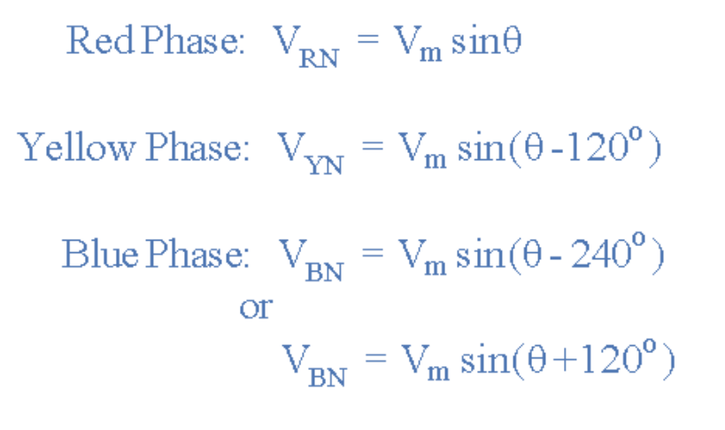 若以VRN为参考电压,则黄色相位电压滞后VRN120°,蓝色相位电压又滞后VYN120°。亦可表述为蓝色相位电压VBN超前VRN120°。