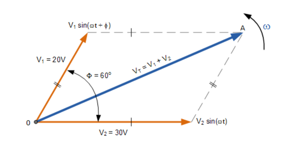 假设两个交流电压V1(峰值20伏)和 V2(峰值30伏),且V1到V2 为60°。总电压VT可通过绘制相量图表示这两个矢量,并构造平行四边形(两边为V1和V2)求得,如下所示: