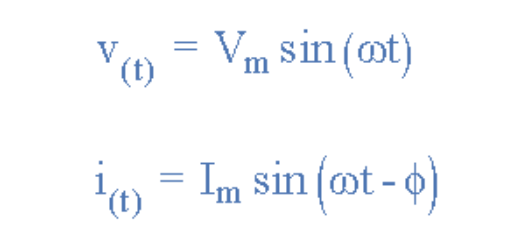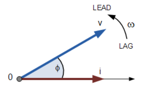 相量图对应时间零点(t=0)绘制在水平轴上。相量的长度与电压(V)和电流(I)在绘制时刻的瞬时值成比例。如前所述,电流相量滞后电压相量角度Φ,因为两个相量逆时针旋转,因此角度Φ也按逆时针方向测量。