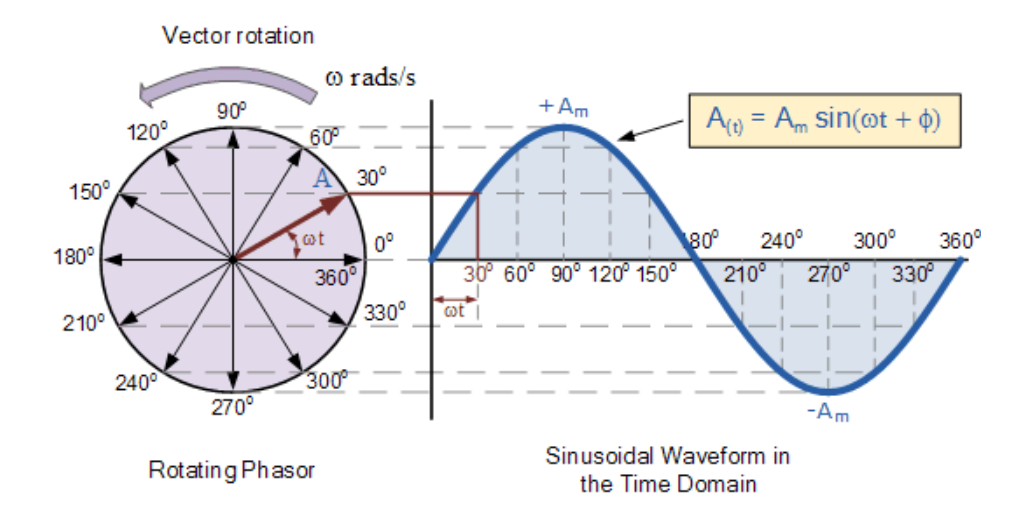 交流量在任意时刻的相位可以通过相量图表示,因此相量图可视为“时间函数”的图形化表达。一个完整的正弦波可通过单个矢量以角速度ω=2πƒ逆时针旋转构建(ƒ为波形频率)。因此,相量是一个兼具“幅值”和“方向”的量。