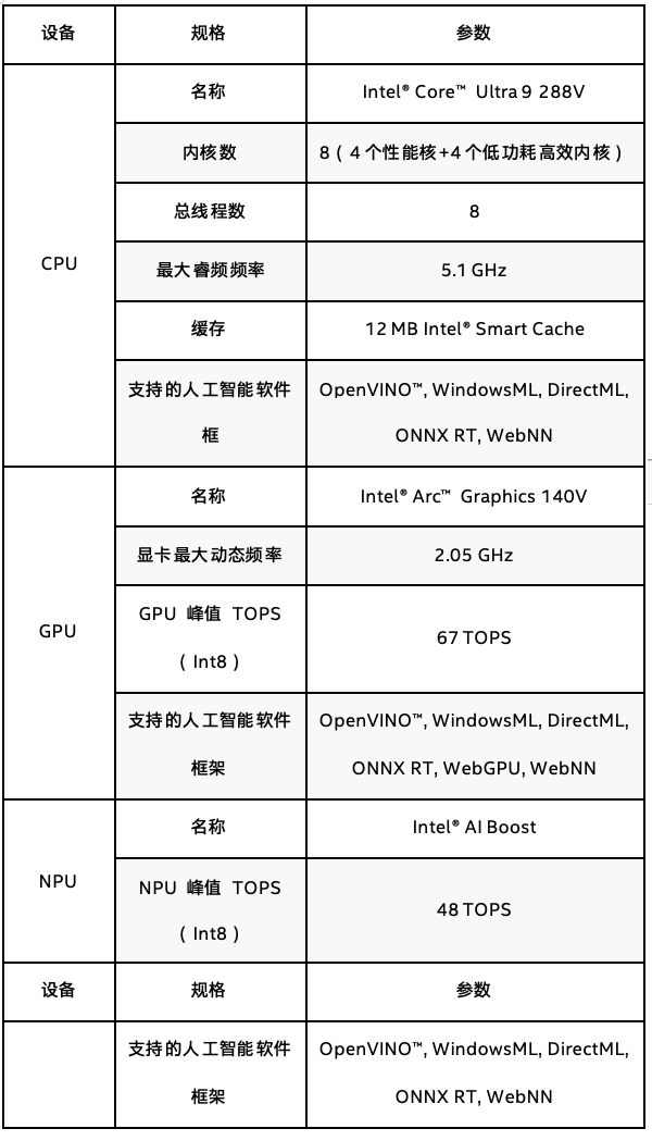 在当前项目测试,使用的是英特尔® 酷睿™ Ultra 9 288V设备,处理器信息如下表所示: