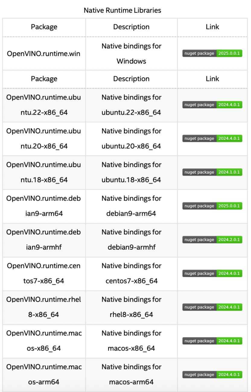 下表为当前发布的 OpenVINO™ C# API NuGet Package,支持多个目标平台,可以通过NuGet一键安装所有依赖。