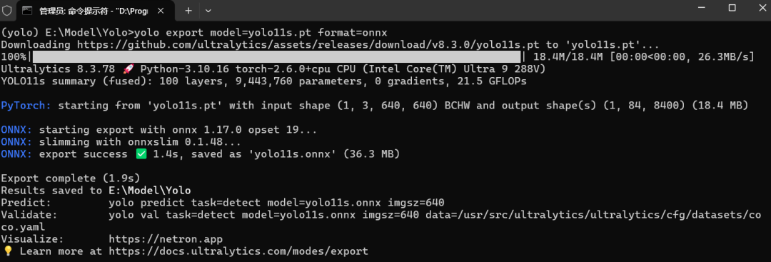 首先导出目标识别模型,此处以官方预训练模型为例,目前ultralytics已经集成了,依次输入以下指令即可: