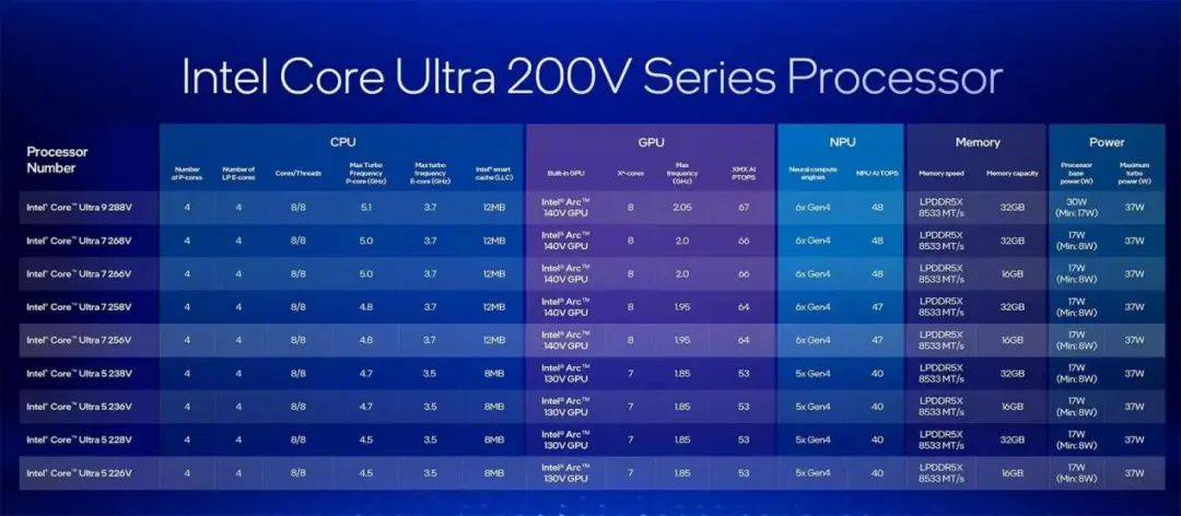 酷睿Ultra 200V系列处理器共有9款SKU,包括1款酷睿Ultra 9、4款酷睿Ultra 7以及4款酷睿Ultra 5,全系8核心8线程(4个性能核与4个能效核),具体规格如下: