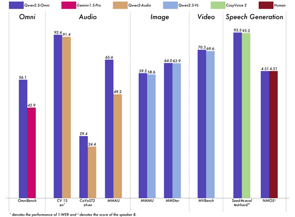 测试中,Qwen2.5-Omni在包括图像,音频,音视频等各种模态下的表现都优于类似大小的单模态模型以及封闭源模型,例如Qwen2.5-VL-7B、Qwen2-Audio和Gemini-1.5-pro。