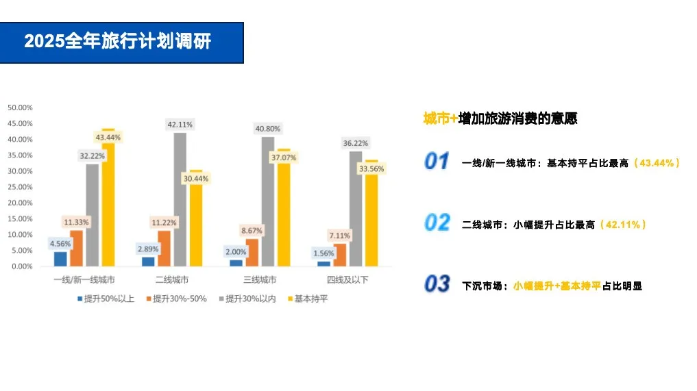 二线城市消费提升明显:二线城市居民中,愿意增加30%以内旅游支出的人群比例最高(42.11%),展现出较强的增长潜力。
