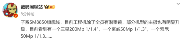 该博主发文称:“子系SM8850旗舰线,目前工程机除了全员有潜望镜,部分机型的主摄也有明显升级,目前看到有一个三星200Mp 1/1.4",一个豪威50Mp 1/1.3",一个索尼50Mp 1/1.3....”根据其介绍,下一代搭载SM8850(第二代骁龙8至尊版)的子品牌新机目前看来工程机全都配备有潜望长焦镜头,这意味着子品牌旗舰机在长焦拍摄上将会提升明显。此外,包括三星2亿像素大底主摄、豪威和索尼的5000万像素大底主摄也都有出现,这可能表明除了主品牌的Ultra系列机型外,子品牌也要开始卷影像了。