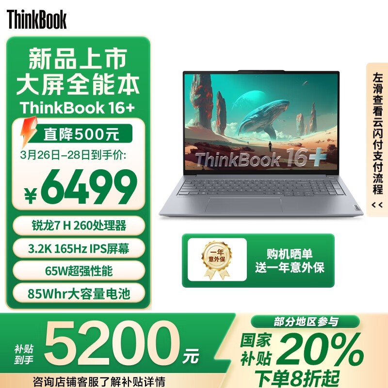 联想ThinkBook 16+锐龙版AI全能本大促到手5200元