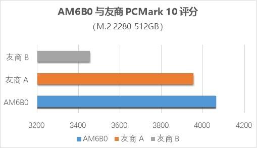 为验证产品的综合性能,测试团队在诸多办公场景下对AM6B0进行了全面基准测试。在PCMark 10测试中,AM6B0在多个容量点(如512GB、1TB)的综合评分都超过了4000分,不仅在同系产品中处于领先,同时也高于友商的同类产品。这一得分验证了AM6B0的综合性能,不仅能在日常的办公、娱乐场景中绰绰有余,即使面对中高强度的专业应用(如视频剪辑、工业制图、3D渲染、大型游戏)也能轻松应对,以卓越性能为用户提供流畅的使用体验。