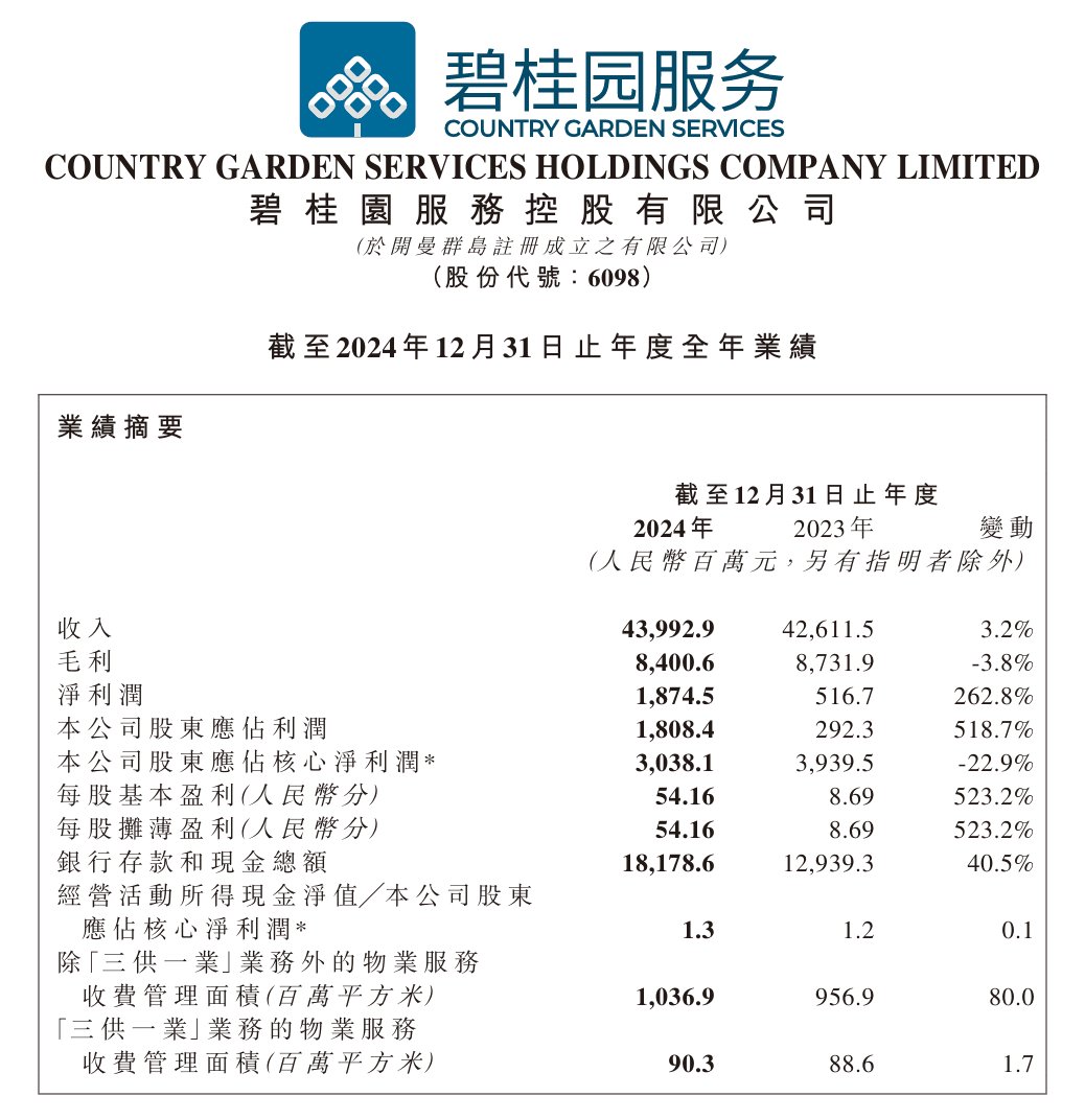 中新经纬3月27日电 碧桂园服务27日午间披露年报,2024年实现收入约为439.93亿元,同比增长3.2%;毛利为84.01亿元,同比下降3.8%;净利润18.75亿元,同比增长262.8%;股东应占利润18.08亿元,同比大幅增长518.7%。