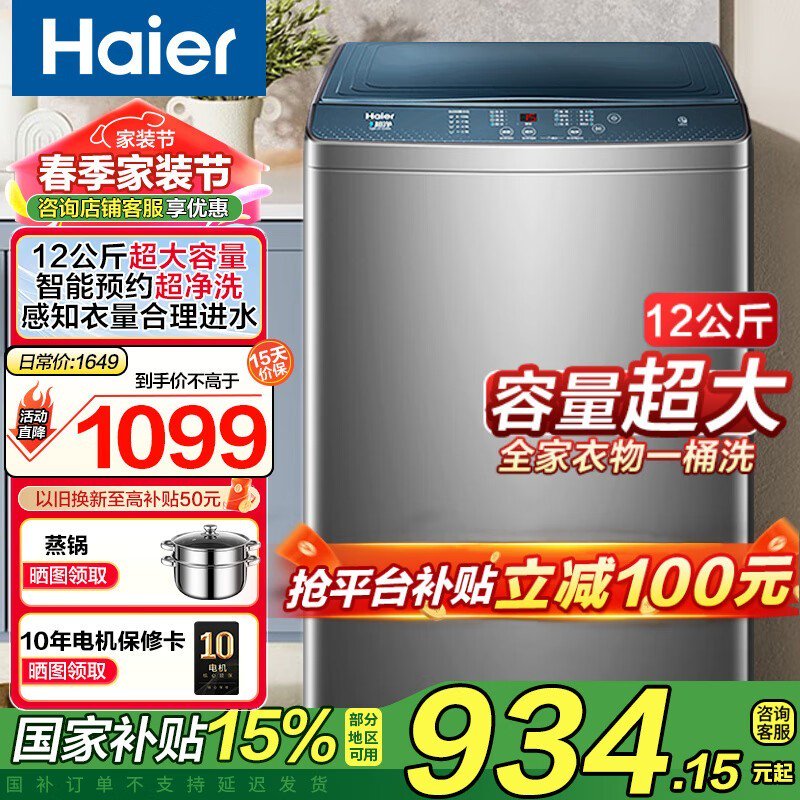 海尔全自动波轮洗衣机12KG大容量懒人好价904元到手