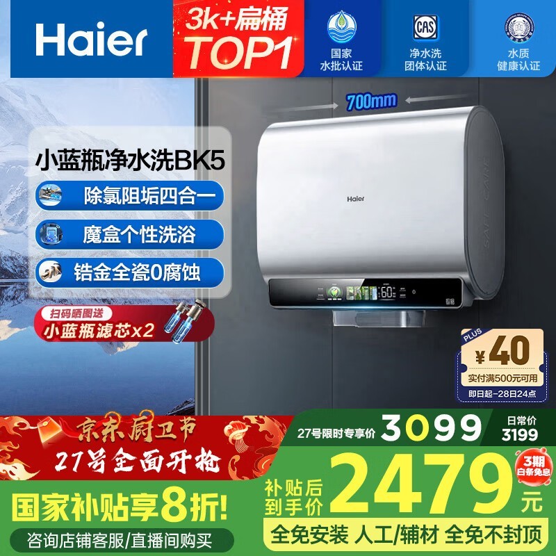 海尔60L电热水器,京东优惠价2437元