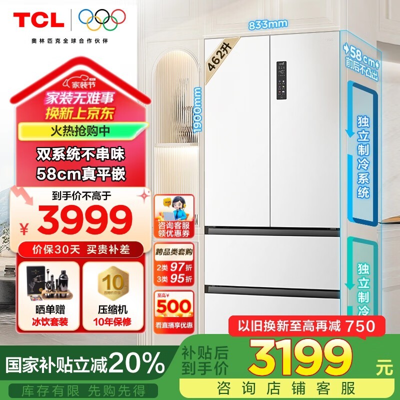TCL462升T9Pro法式四门冰箱双系统双循环超薄平嵌