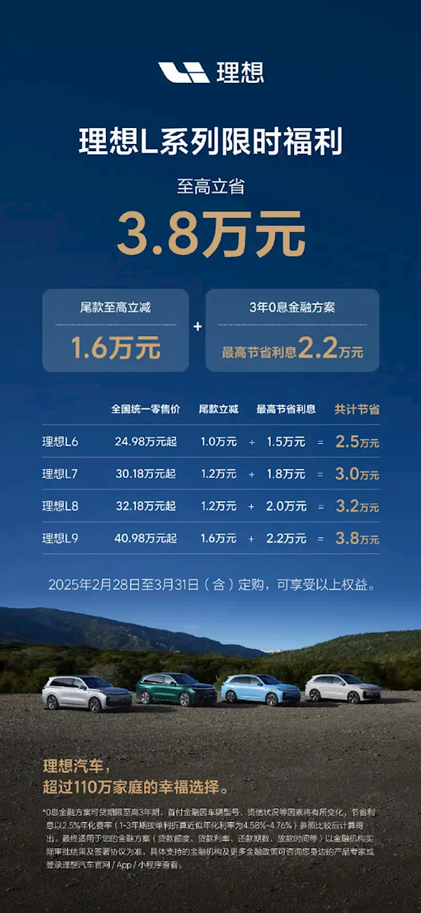 此前,理想汽车官方确实宣布了一项针对理想L系列的限时福利政策,该政策从2月28日开始至3月31日,购车者可以享受包括尾款至高立减1.6万元,以及3年0息最高节省利息2.2万元的优惠。
