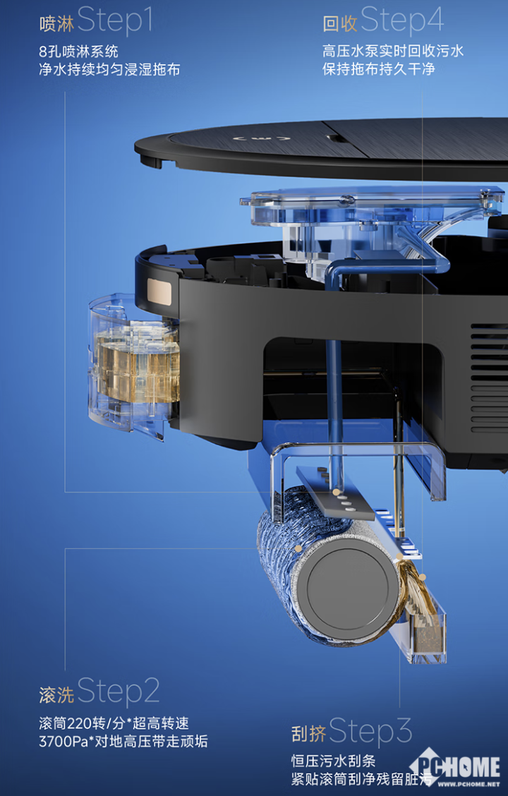 而其恒压活水滚筒洗地技术则是通过每分钟200转的超高转速,配合远超于传统抹布盘方案的3700Pa对地压强,不仅更好的为用户解决了顽固污渍的清洁问题,还解决了传统抹布盘"带污返脏"的问题,彻底避免了“以脏拖脏”。