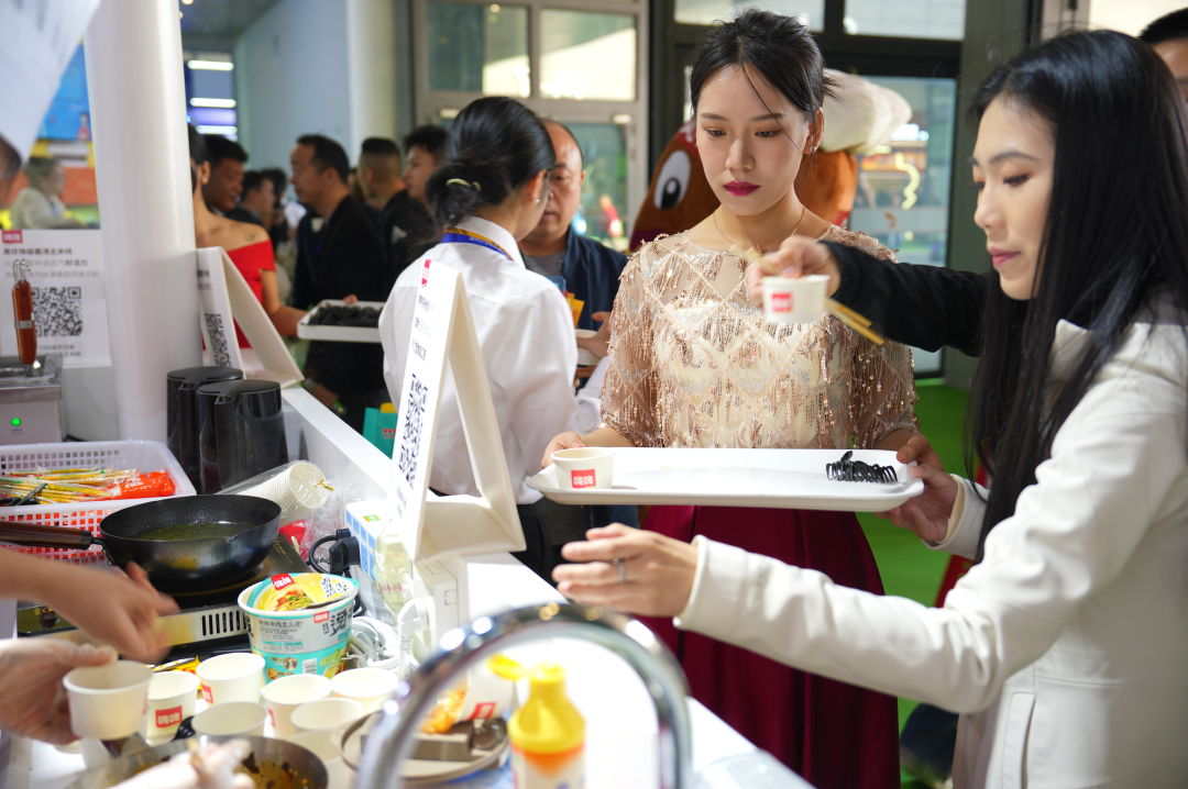 踏入西博城现场,喧嚣热闹扑面而来。人潮涌动,往来穿梭。当人们走到咚咚展位前时,脚步便不由自主地停下了。时尚绚丽的展位,琳琅满目的产品陈列得井然有序,各类口味的米线整齐排列,丰富多样的包装设计让人眼前一亮,充分展现出咚咚食品深厚的底蕴。