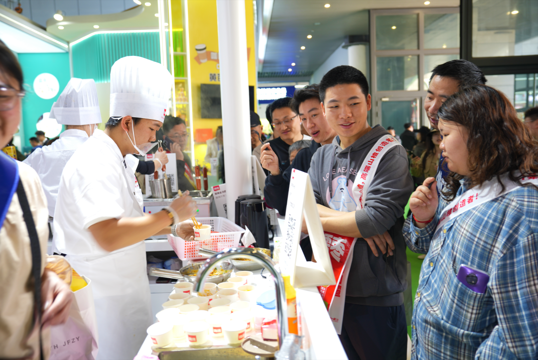 要说会展中心炸场子的表现,当属咚咚米线展位前排起试吃的长龙。只见帅气大厨亲自上手,熟练地拿起米线进行快煮示范,又有美丽的礼仪小姐,向现场观众介绍咚咚米线的独特之处与优势,让观众直观感受到产品的便捷与美味,吸引了络绎不绝的人前来排队试吃。