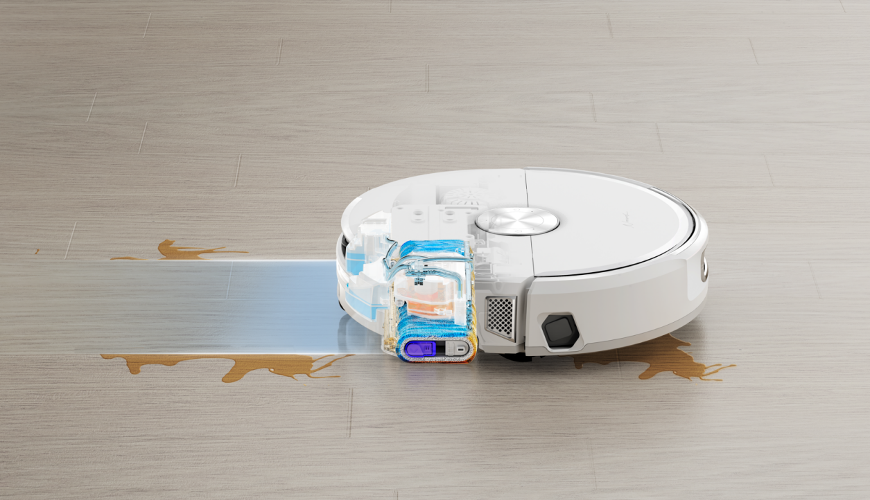 得益于双目AI仿生人眼视觉技术及逍遥AI大模型及10TOPS算力支撑,云鲸逍遥002可支持每秒亿万次的信息处理和每秒百万级的空间点位信息计算,拥有更贴近人类双眼的能力,能识别超过200种常见的家庭障碍物,达到毫米级超高精度识别,实现了精准、灵活避障。同时,依托超高精度的AI视觉识别能力及脏污传感器,云鲸逍遥002能够根据不同类型的地面脏污类型自主执行最佳清洁策略,遇干即扫,遇湿即拖。在识别到重污区域后,机器人会主动停转边刷,采用倒退清洁策略,避免边刷污染;并根据脏污程度调节复洗复拖次数,实现“识-扫-拖-洗”主动闭环,全程无需人工干预,拖到干净为止。