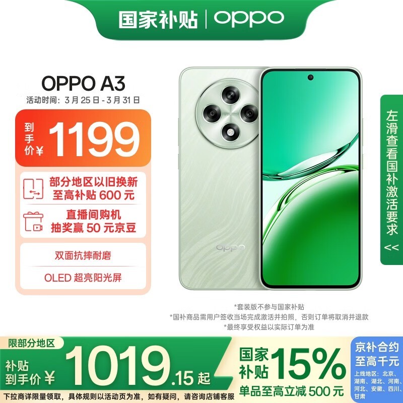 OPPO A3 5G手机山涧绿8GB+256GB大内存配置