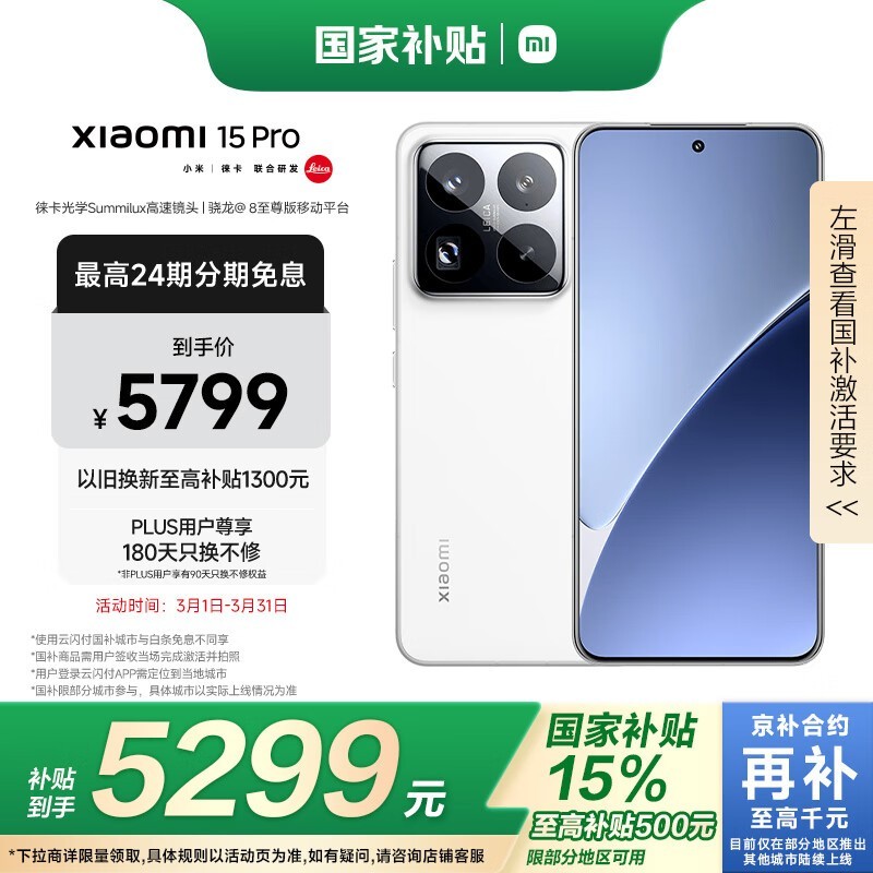 小米15 Pro 5G旗舰手机京东限时优惠至4909元