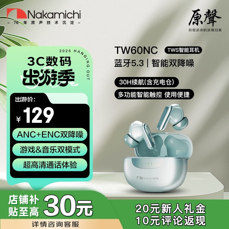 中道TW60NC蓝牙耳机主动通话降噪入耳式京东99元包邮