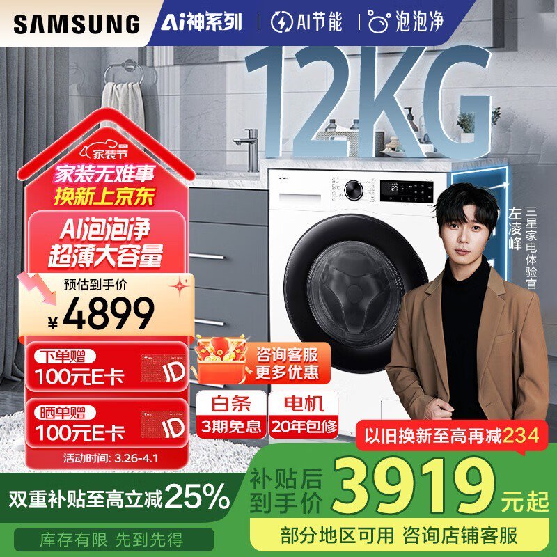 三星WW12DG5B24AWSC滚筒洗衣机12公斤AI智能京东促销